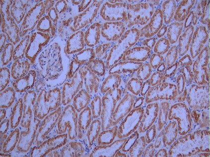 IHC image of CSB-RA208703A0HU diluted at 1:100 and staining in paraffin-embedded human kidney tissue performed on a Leica BondTM system. After dewaxing and hydration, antigen retrieval was mediated by high pressure in a citrate buffer (pH 6.0). Section was blocked with 10% normal goat serum 30min at RT. Then primary antibody (1% BSA) was incubated at 4°C overnight. The primary is detected by a Goat anti-rabbit polymer IgG labeled by HRP and visualized using 0.05% DAB.