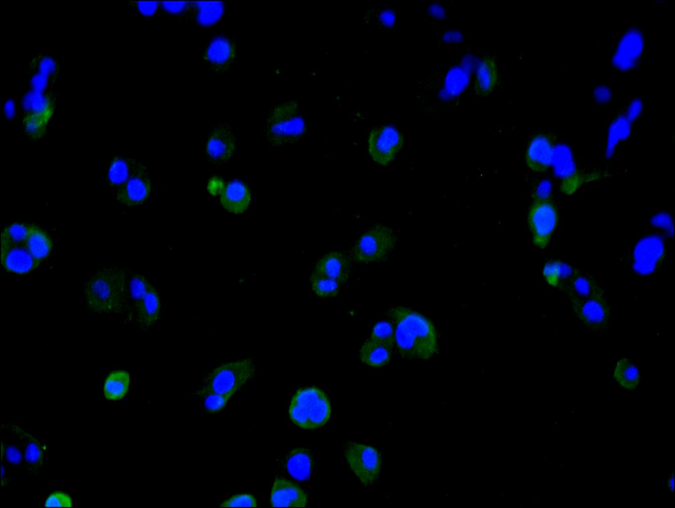 Immunofluorescence staining of Hela cell with CSB-RA897314MA1HU at 1:30 ,counter-stained with DAPI. The cells were fixed in 4% formaldehyde, permeabilized using 0.2% Triton X-100 and blocked in 10% normal Goat Serum. The cells were then incubated with the antibody overnight at 4°C. The secondary antibody was Fluorescein (FITC) AffiniPure Goat Anti-Human IgG, Fcγ fragment specific.