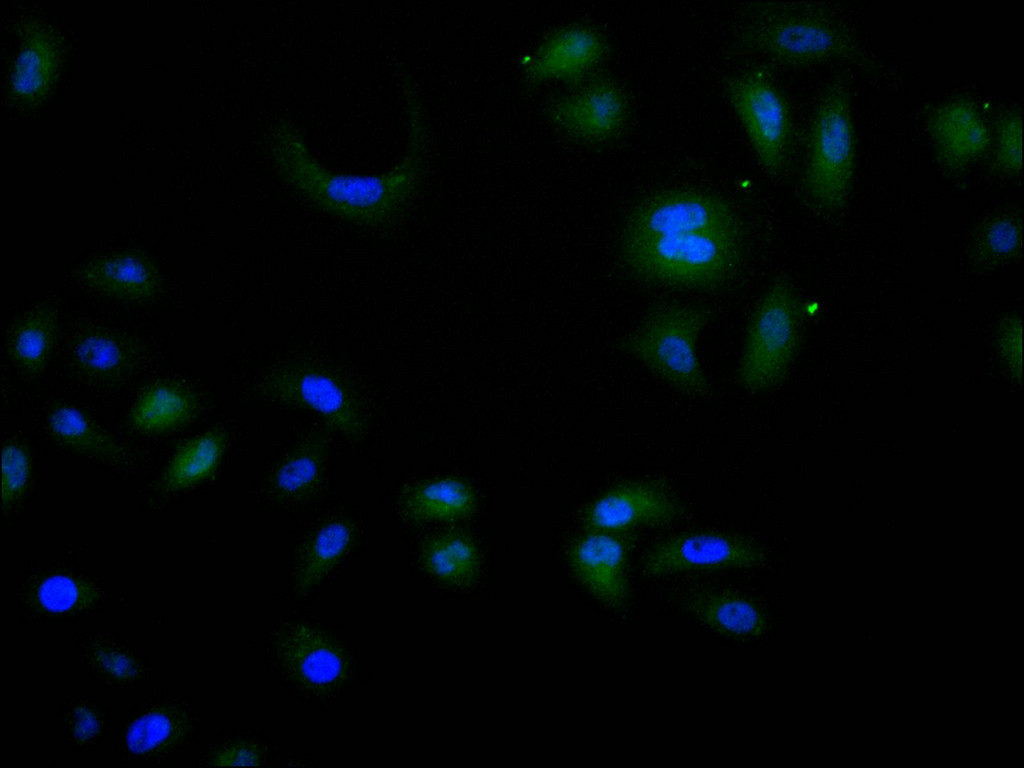 Immunofluorescence staining of Hela cell with CSB-RA190124A0HU at 1:50, counter-stained with DAPI. The cells were fixed in 4% formaldehyde, permeabilized using 0.2% Triton X-100 and blocked in 10% normal Goat Serum. The cells were then incubated with the antibody overnight at 4°C. The secondary antibody was Alexa Fluor 488-congugated AffiniPure Goat Anti-Rabbit IgG(H+L).