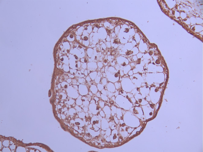 IHC image of CSB-RA190124A0HU diluted at 1:100 and staining in paraffin-embedded human placenta tissue performed on a Leica BondTM system. After dewaxing and hydration, antigen retrieval was mediated by high pressure in a citrate buffer (pH 6.0). Section was blocked with 10% normal goat serum 30min at RT. Then primary antibody (1% BSA) was incubated at 4°C overnight. The primary is detected by a Goat anti-rabbit polymer IgG labeled by HRP and visualized using 0.05% DAB.