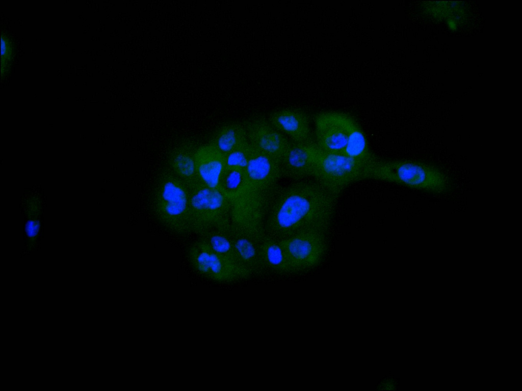 Immunofluorescence staining of A431 cell with CSB-RA909458A0HU at 1:50, counter-stained with DAPI. The cells were fixed in 4% formaldehyde, permeabilized using 0.2% Triton X-100 and blocked in 10% normal Goat Serum. The cells were then incubated with the antibody overnight at 4°C. The secondary antibody was Alexa Fluor 488-congugated AffiniPure Goat Anti-Rabbit IgG(H+L).