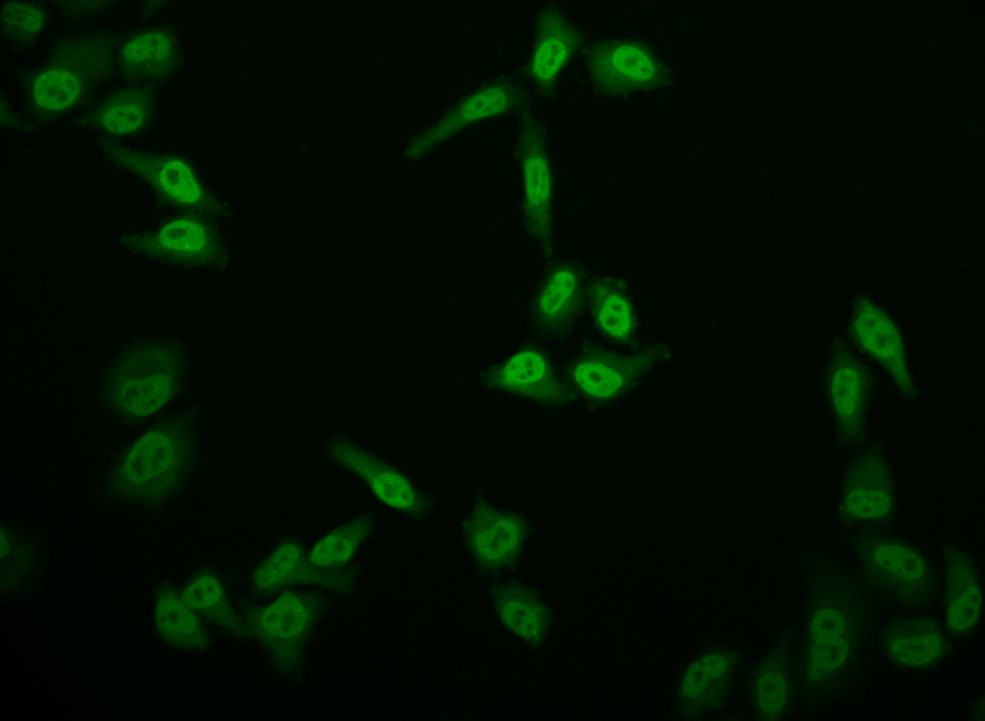 Immunofluorescence staining of Hela cell with CSB-RA179313A0HU at 1:50, counter-stained with DAPI. The cells were fixed in 4% formaldehyde and blocked in 10% normal Goat Serum. The cells were then incubated with the antibody overnight at 4°C. The secondary antibody was Alexa Fluor 513-congugated AffiniPure Goat Anti-Rabbit IgG(H+L).