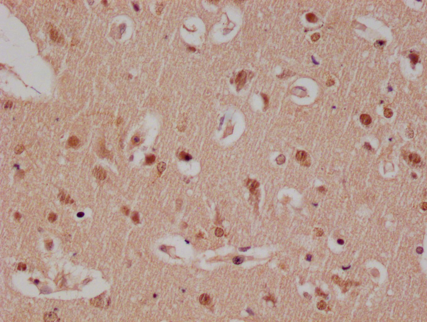 IHC image of CSB-RA179313A0HU diluted at 1:100 and staining in paraffin-embedded human brain tissue performed on a Leica BondTM system. After dewaxing and hydration, antigen retrieval was mediated by high pressure in a citrate buffer (pH 6.0). Section was blocked with 10% normal goat serum 30min at RT. Then primary antibody (1% BSA) was incubated at 4°C overnight. The primary is detected by a Goat anti-rabbit polymer IgG labeled by HRP and visualized using 0.05% DAB.