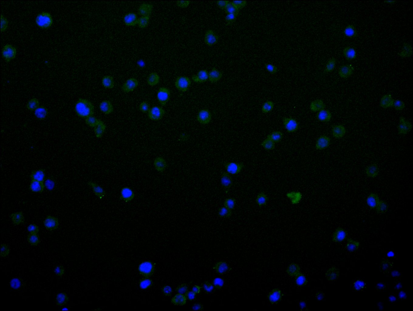 • Immunofluorescence staining of Jurkat cell with CSB-RA053731A0HU at 1:50, counter-stained with DAPI. The cells were fixed in 4% formaldehyde, permeabilized using 0.2% Triton X-100 and blocked in 10% normal Goat Serum. The cells were then incubated with the antibody overnight at 4°C. The secondary antibody was Alexa Fluor 488-congugated AffiniPure Goat Anti-Rabbit IgG(H+L).