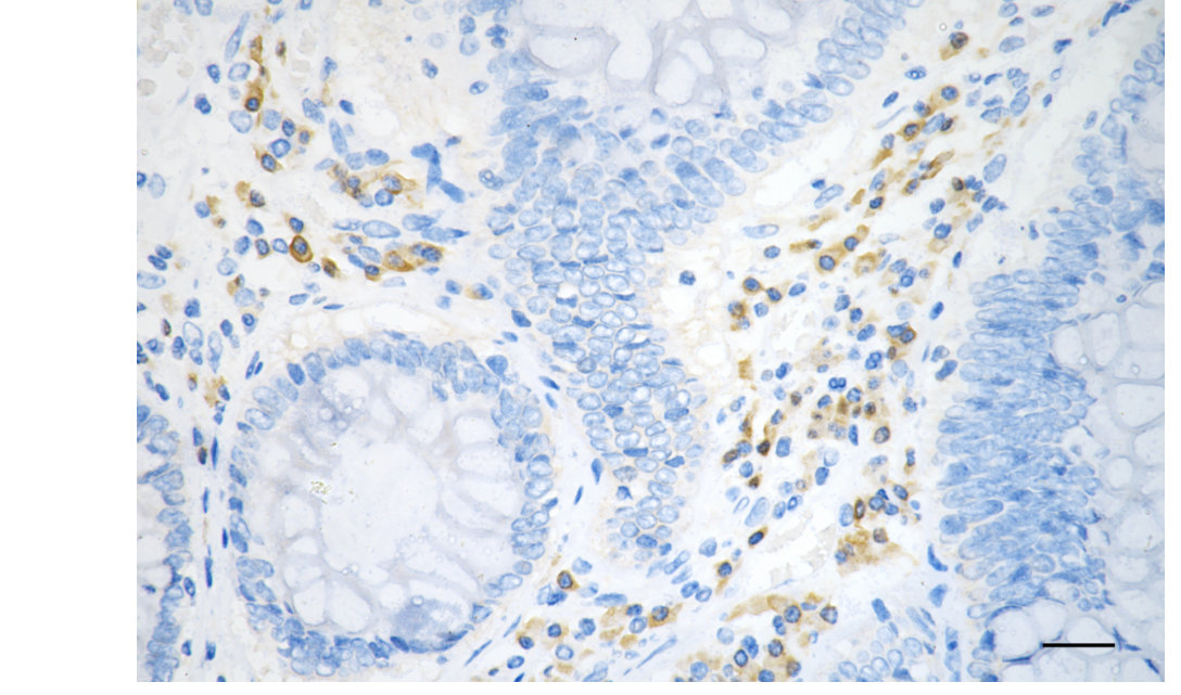 • Immunohistochemistry was performed on paraffin-embedded human sigmoid colon carcinoma using eukaryotic translation elongation factor 2 antibody. Antigen retrieval was done in sodium citrate buffer (pH 6.0). DAB was used for detection, with hematoxylin counterstaining. Images were acquired using a Nikon Ci-L Plus microscope (40× objective). Scale bar: 25 μm.