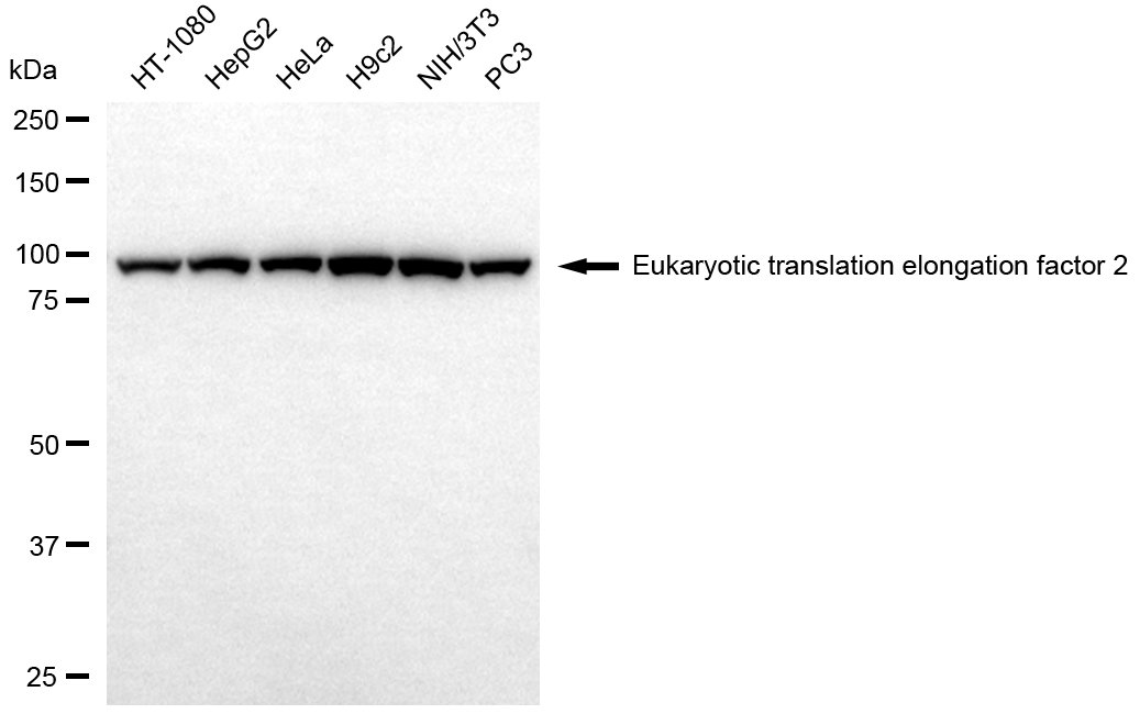 • Western blotting analysis using eukaryotic translation elongation factor 2 antibody. Total cell lysates (20 μg) from various cell lines were loaded and separated by SDS-PAGE. The blot was incubated with eukaryotic translation elongation factor 2 antibody and HRP-conjugated goat anti-rabbit secondary antibody respectively.