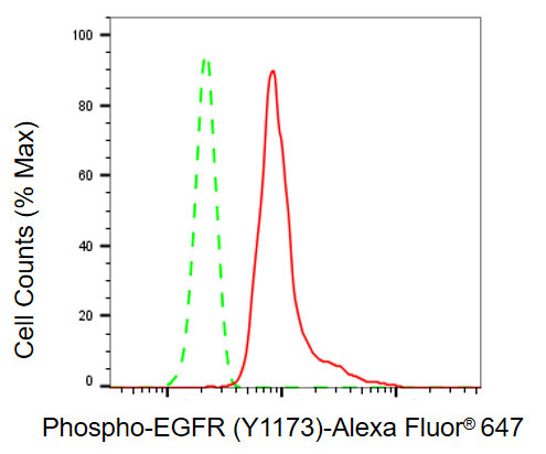Flow cytometric analysis of phospho-EGFR (Y1173) expression in HepG2 cells using phospho-EGFR (Y1173) antibody. Green, isotype control; red, phospho-EGFR (Y1173).