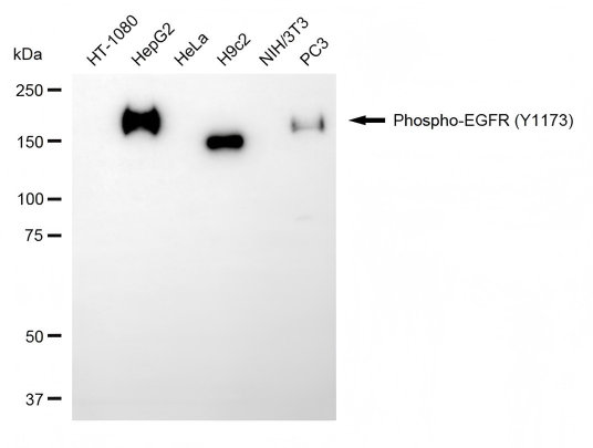 Western blotting analysis using phospho-EGFR (Y1173) antibody. Total cell lysates (30 μg) from various cell lines were loaded and separated by SDS-PAGE. The blot was incubated with phospho-EGFR (Y1173) antibody and HRP-conjugated goat anti-rabbit secondary antibody respectively.