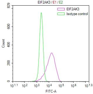 • Overlay Peak curve showing Hela cells stained with CSB-RA007512MA1HU (red line) at 1:100. The cells were fixed in 4% formaldehyde and permeated by 0.2% TritonX-100 for 10min. Then 10% normal goat serum to block non-specific protein-protein interactions followed by the antibody (1ug/1*106cells) for 45min at 4℃. The secondary antibody used was Fluorescein (FITC) AffiniPure Goat Anti-Human IgG, Fcγ fragment specific at 1:200 dilution for 35 min at 4℃.Control antibody (green line) was human IgG1 (1ug/1*106cells) used under the same conditions. Acquisition of >10,000 events was performed.