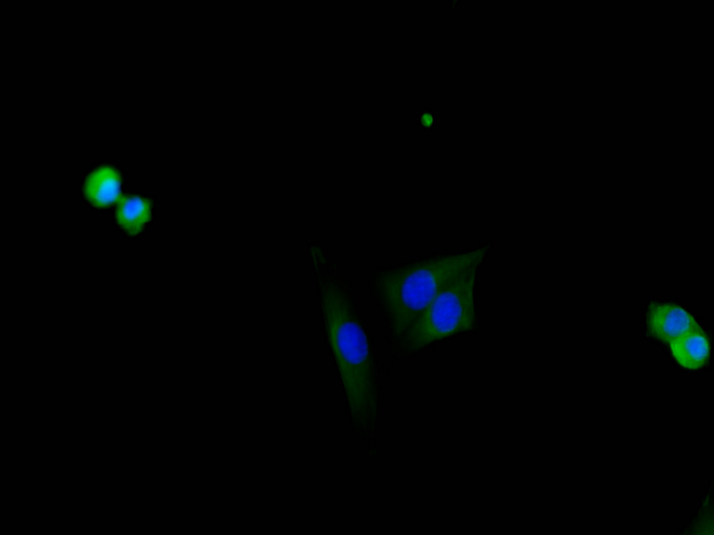 Immunofluorescence staining of NIH-3T3 cell with CSB-RA249552A0HU at 1:50 , counter-stained with DAPI. The cells were fixed in 4% formaldehyde, permeabilized using 0.2% Triton X-100 and blocked in 10% normal Goat Serum. The cells were then incubated with the antibody overnight at 4°C. The secondary antibody was Alexa Fluor 488-congugated AffiniPure Goat Anti-Rabbit IgG(H+L).