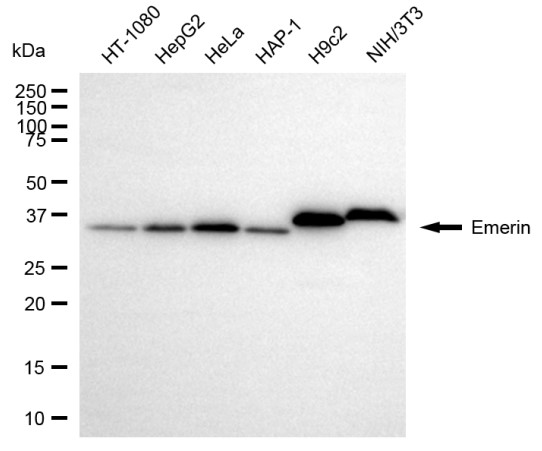Western blotting analysis using emerin antibody. Total cell lysates (30 μg) from various cell lines were loaded and separated by SDS-PAGE. The blot was incubated with emerin antibody and HRP-conjugated goat anti-rabbit secondary antibody respectively.
