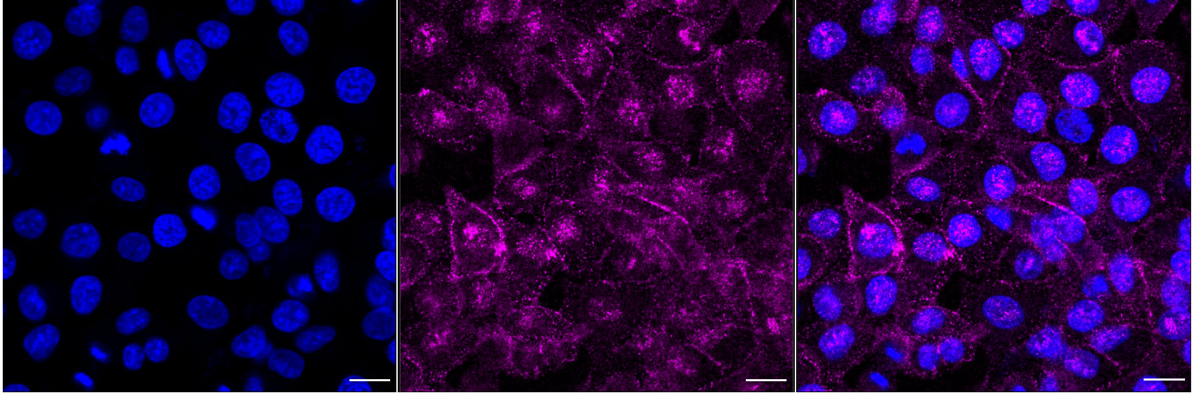 Immunocytochemical staining of HT-1080 cells with Epsin 1 antibody. Nuclei were stained blue with DAPI; Epsin 1 was stained magenta with Alexa Fluor? 647. Images were taken using Leica stellaris 5. Protein abundance based on laser Intensity and smart gain: Medium. Scale bar, 20 μm.