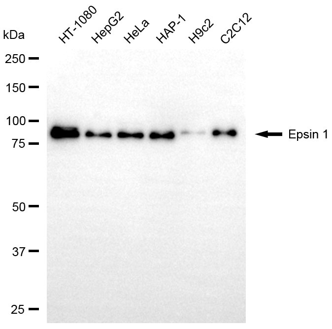 Western blotting analysis using epsin 1 antibody. Total cell lysates (30 μg) from various cell lines were loaded and separated by SDS-PAGE. The blot was incubated with epsin 1 antibody and HRP-conjugated goat anti-rabbit secondary antibody respectively.
