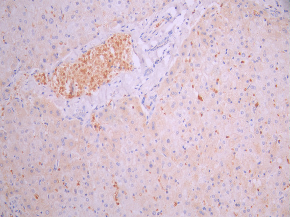 IHC image of CSB-RA007743MA1HU diluted at 1:50 and staining in paraffin-embedded human liver tissue performed on a Leica BondTM system. After dewaxing and hydration, antigen retrieval was mediated by high pressure in a citrate buffer (pH 6.0). Section was blocked with 10% normal goat serum 30min at RT. Then primary antibody (1% BSA) was incubated at 4°C overnight. The primary is detected by a Anti-Human lgG, Fcy Fragment Specific labeled by HRP and visualized using 0.05% DAB.
