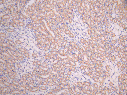IHC image of CSB-RA007743MA1HU diluted at 1:50 and staining in paraffin-embedded human kidney tissue performed on a Leica BondTM system. After dewaxing and hydration, antigen retrieval was mediated by high pressure in a citrate buffer (pH 6.0). Section was blocked with 10% normal goat serum 30min at RT. Then primary antibody (1% BSA) was incubated at 4°C overnight. The primary is detected by a Anti-Human lgG, Fcy Fragment Specific labeled by HRP and visualized using 0.05% DAB.