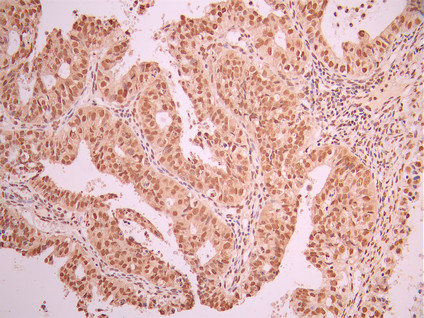 IHC image of CSB-RA250899A0HU diluted at 1:100 and staining in paraffin-embedded human ovarian cancer performed on a Leica BondTM system. After dewaxing and hydration, antigen retrieval was mediated by high pressure in a citrate buffer (pH 6.0). Section was blocked with 10% normal goat serum 30min at RT. Then primary antibody (1% BSA) was incubated at 4°C overnight. The primary is detected by a Goat anti-rabbit polymer IgG labeled by HRP and visualized using 0.05% DAB.