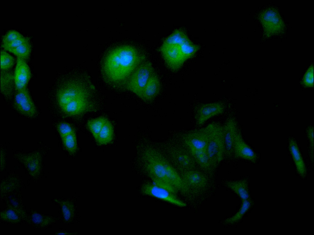 • Immunofluorescence staining of MCF-7 cell with CSB-RA121108A0HU at 1:50, counter-stained with DAPI. The cells were fixed in 4% formaldehyde, permeabilized using 0.2% Triton X-100 and blocked in 10% normal Goat Serum. The cells were then incubated with the antibody overnight at 4°C. The secondary antibody was Alexa Fluor 488-congugated AffiniPure Goat Anti-Rabbit IgG(H+L).