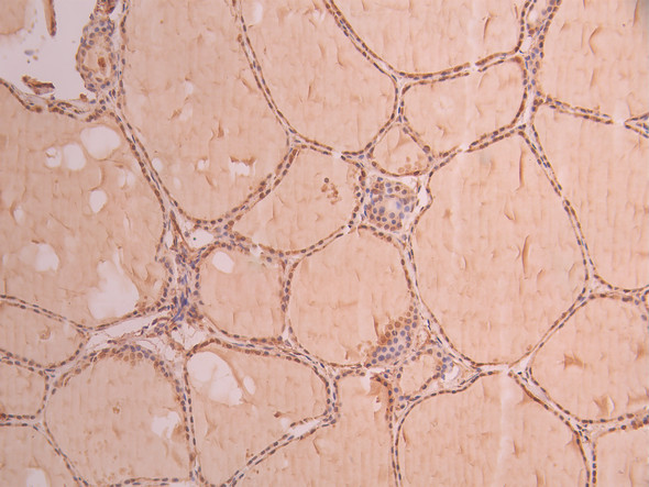 • IHC image of CSB-RA121108A0HU diluted at 1:100 and staining in paraffin-embedded human thyroid tissue performed on a Leica BondTM system. After dewaxing and hydration, antigen retrieval was mediated by high pressure in a citrate buffer (pH 6.0). Section was blocked with 10% normal goat serum 30min at RT. Then primary antibody (1% BSA) was incubated at 4°C overnight. The primary is detected by a Goat anti-rabbit polymer IgG labeled by HRP and visualized using 0.05% DAB.