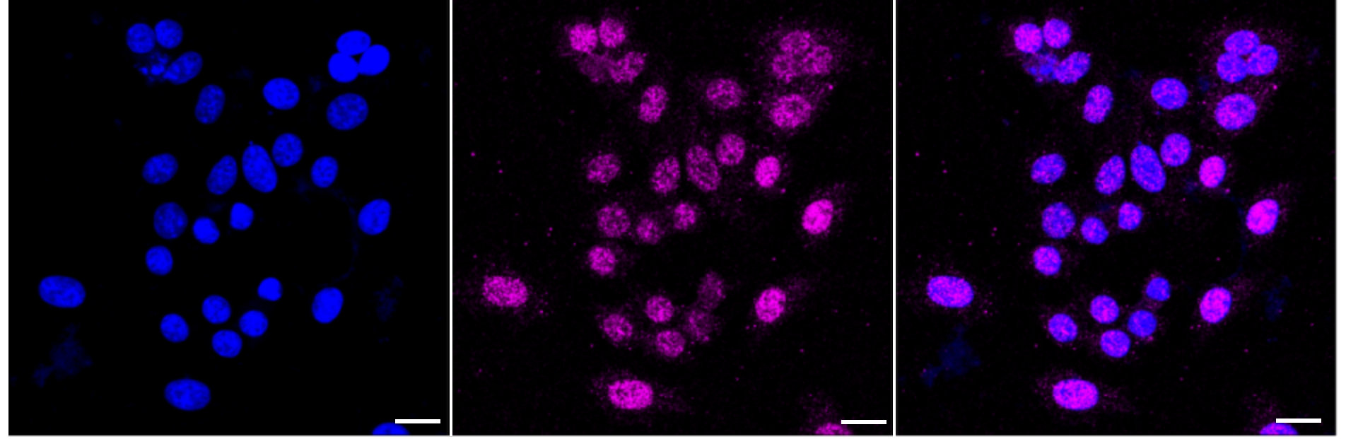 • Immunocytochemical staining of HepG2 cells with Forkhead box O3 antibody. Nuclei were stained blue with DAPI; Forkhead box O3 was stained magenta with Alexa Fluor? 647. Images were taken using leica stellaris 5. Protein abundance based on laser intensity and smart gain: Medium. Scale bar: 20 μm.