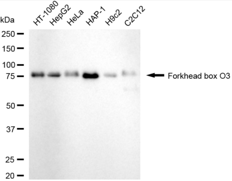 • Western blotting analysis using Forkhead box O3 antibody. Total cell lysates (30 μg) from various cell lines were loaded and separated by SDS-PAGE. The blot was incubated with Forkhead box O3 antibody and HRP-conjugated goat anti-rabbit secondary antibody respectively.