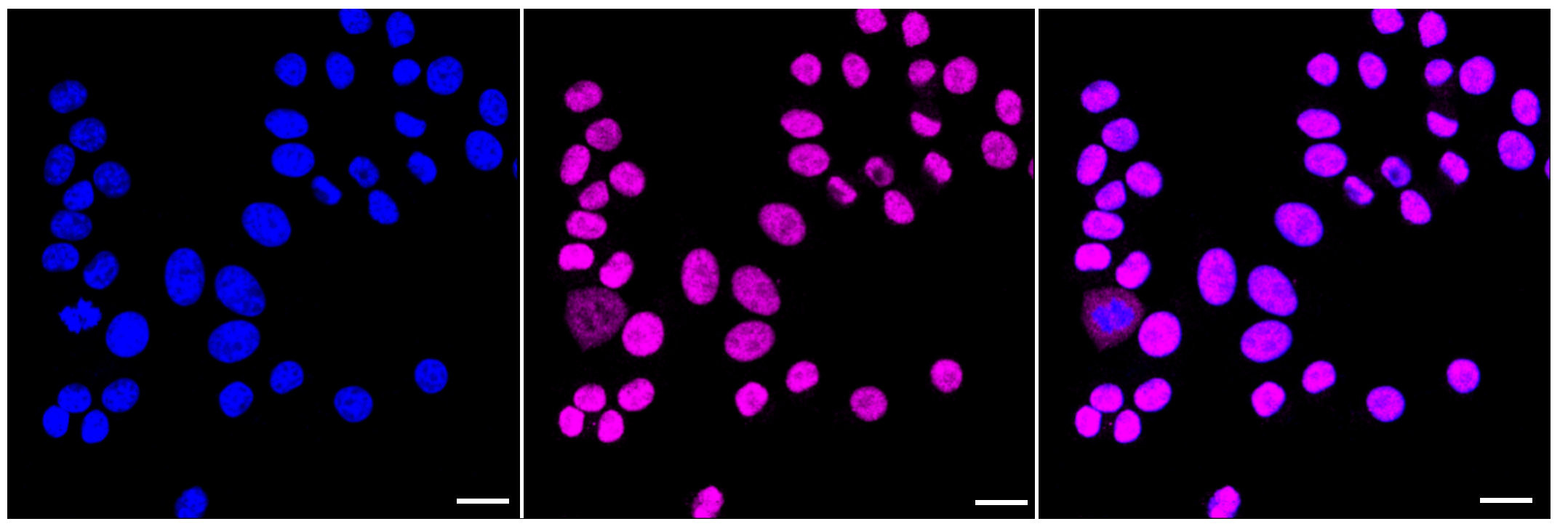 Immunocytochemical staining of HepG2 cells with FTO antibody. Nuclei were stained blue with DAPI; FTO was stained magenta with Alexa Fluor? 647. Images were taken using Leica stellaris 5. Protein abundance based on laser Intensity and smart gain: Medium. Scale bar: 20 μm.