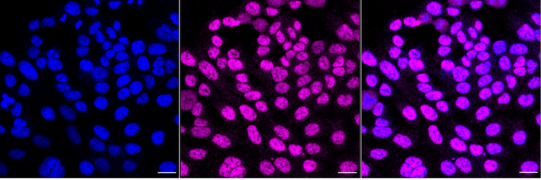 Immunocytochemical staining of HAP1 cells with FTO antibody. Nuclei were stained blue with DAPI;FTO was stained magenta with Alexa Fluor? 647. Images were taken using Leica stellaris 5. Protein abundance based on laser Intensity and smart gain: Medium. Scale bar, 20 μm.