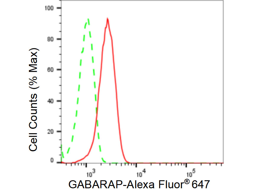 Flow cytometric analysis of GABARAP expression in HepG2 cells using GABARAP antibody. Green, isotype control; red, GABARAP.