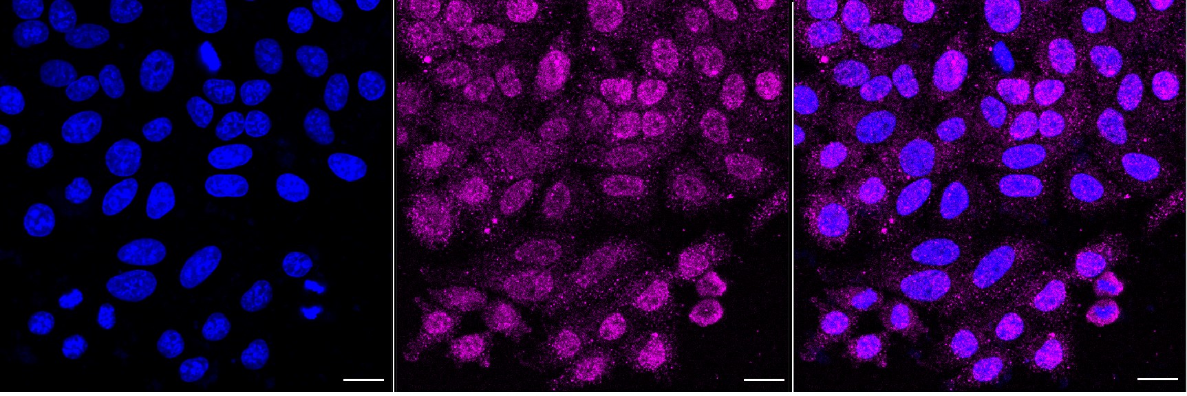 Immunocytochemical staining of HepG2 cells with phospho-GATA3 (S308) antibody. Nuclei were stained blue with DAPI; Phospho-GATA3 (S308) was stained magenta with Alexa Fluor? 647. Images were taken using Leica stellaris 5. Protein abundance based on laser Intensity and smart gain: Medium. Scale bar, 20 μm.