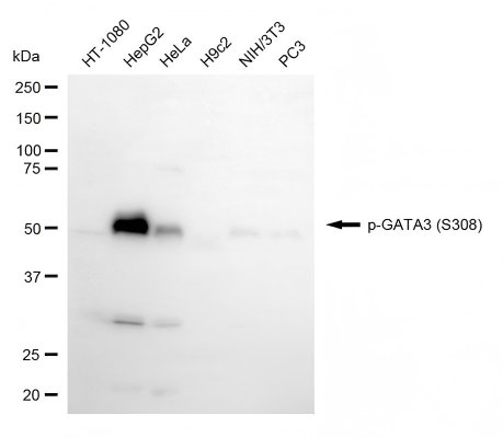 Western blotting analysis using phospho-GATA3 (S308) antibody. Total cell lysates (30 μg) from various cell lines were loaded and separated by SDS-PAGE. The blot was incubated with phospho-GATA3 (S308) antibody and HRP-conjugated goat anti-rabbit secondary antibody respectively.