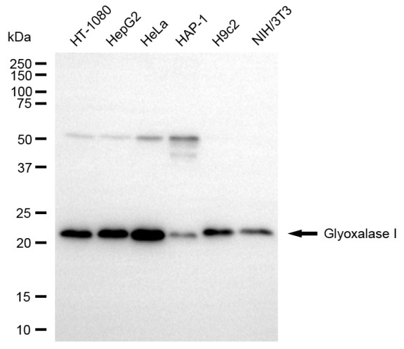 Western blotting analysis using glyoxalase I antibody. Total cell lysates (30 μg) from various cell lines were loaded and separated by SDS-PAGE. The blot was incubated with glyoxalase I antibody and HRP-conjugated goat anti-rabbit secondary antibody respectively.