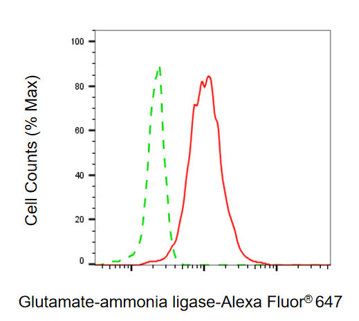 • Flow cytometric analysis of Glutamate-ammonia ligase expression in HeLa cells using Glutamate-ammonia ligase antibody. Green, isotype control; red, Glutamate-ammonia ligase.