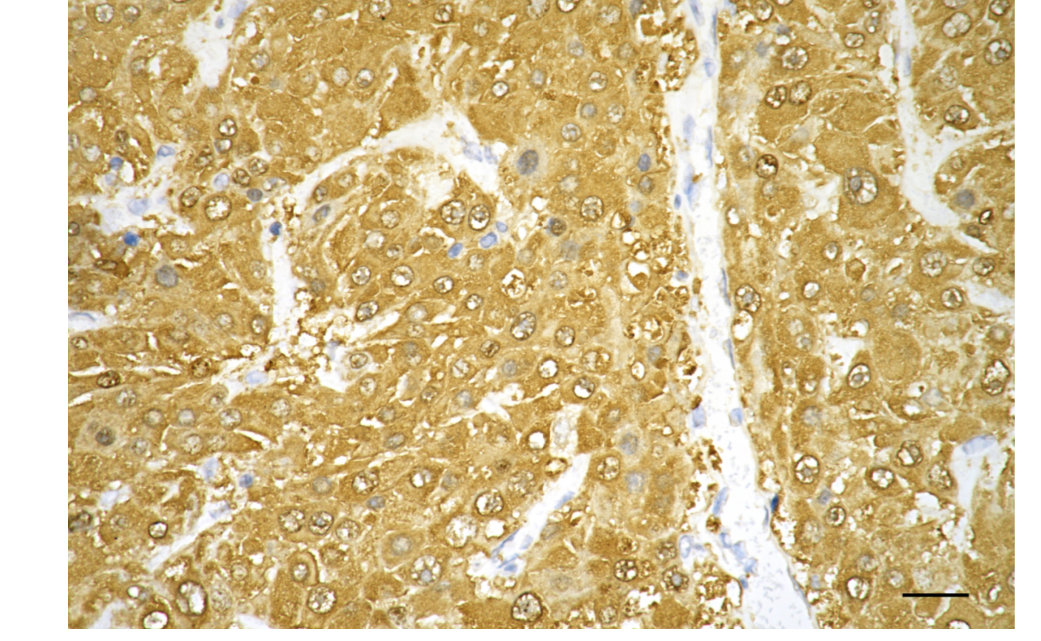• Immunohistochemistry was performed on paraffin-embedded human hepatocarcinoma using Glutamate-ammonia ligase antibody. Antigen retrieval was done in sodium citrate buffer (pH 6.0). DAB was used for detection, with hematoxylin counterstaining. Images were acquired using a Nikon Ci-L Plus microscope (40× objective). Scale bar: 25 μm.