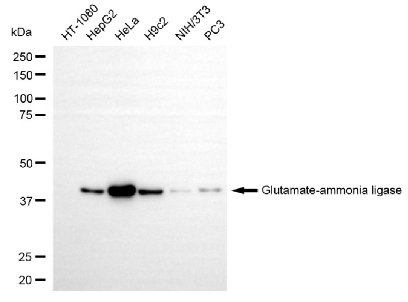 • Western blotting analysis using glutamate-ammonia ligase antibody. Total cell lysates (30 μg) from various cell lines were loaded and separated by SDS-PAGE. The blot was incubated with glutamate-ammonia ligase antibody and HRP-conjugated goat anti-rabbit secondary antibody respectively.