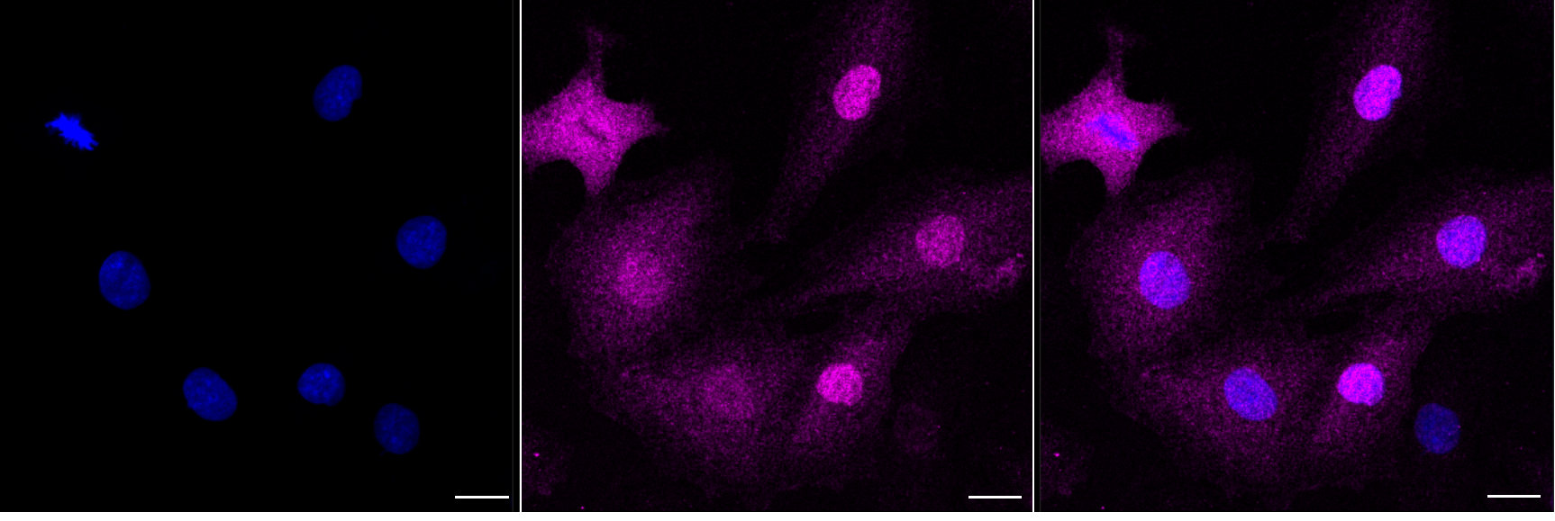 Immunocytochemical staining of H9C2 cells with GMNN antibody. Nuclei were stained blue with DAPI; GMNN was stained magenta with Alexa Fluor? 647. Images were taken using Leica stellaris 5. Protein abundance based on laser Intensity and smart gain:Low. Scale bar, 20 μm.