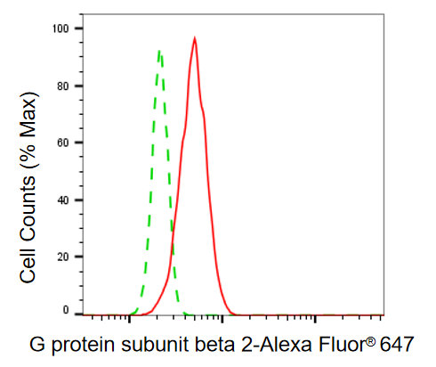 • Flow cytometric analysis of G protein subunit beta 2 expression in HT-1080 cells using G protein subunit beta 2 antibody. Green, isotype control; red, G protein subunit beta 2.