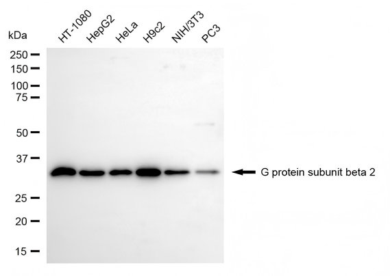 • Western blotting analysis using G protein subunit beta 2 antibody. Total cell lysates (30 μg) from various cell lines were loaded and separated by SDS-PAGE. The blot was incubated with G protein subunit beta 2 antibody and HRP-conjugated goat anti-rabbit secondary antibody respectively.