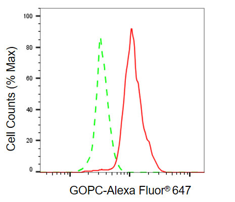 Flow cytometric analysis of GOPC expression in Hela cells using GOPC antibody. Green, isotype control; red, GOPC.
