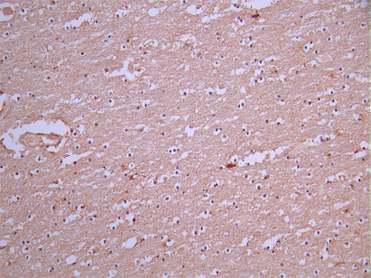 IHC image of CSB-RA088025A0HU diluted at 1:100 and staining in paraffin-embedded human brain tissue performed on a Leica BondTM system. After dewaxing and hydration, antigen retrieval was mediated by high pressure in a citrate buffer (pH 6.0). Section was blocked with 10% normal goat serum 30min at RT. Then primary antibody (1% BSA) was incubated at 4°C overnight. The primary is detected by a Goat anti-rabbit polymer IgG labeled by HRP and visualized using 0.05% DAB.