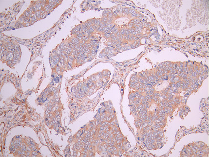 IHC image of CSB-RA088025A0HU diluted at 1:100 and staining in paraffin-embedded human colorectal cancer performed on a Leica BondTM system. After dewaxing and hydration, antigen retrieval was mediated by high pressure in a citrate buffer (pH 6.0). Section was blocked with 10% normal goat serum 30min at RT. Then primary antibody (1% BSA) was incubated at 4°C overnight. The primary is detected by a Goat anti-rabbit polymer IgG labeled by HRP and visualized using 0.05% DAB.