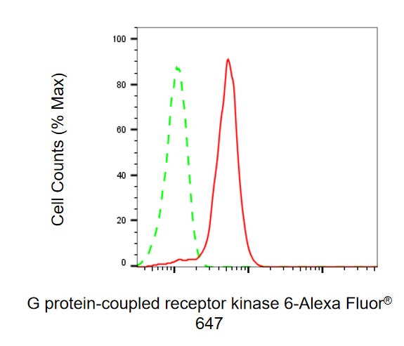 Flow cytometric analysis of G protein-coupled receptor kinase 6 expression in HepG2 cells using G protein-coupled receptor kinase 6 antibody. Green, isotype control; red, G protein-coupled receptor kinase 6.