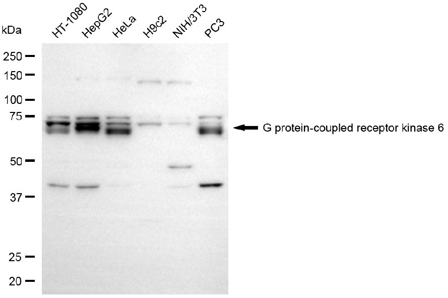 Western blotting analysis using G protein-coupled receptor kinase 6 antibody. Total cell lysates (30 μg) from various cell lines were loaded and separated by SDS-PAGE. The blot was incubated with G protein-coupled receptor kinase 6 antibody and HRP-conjugated goat anti-rabbit secondary antibody respectively.