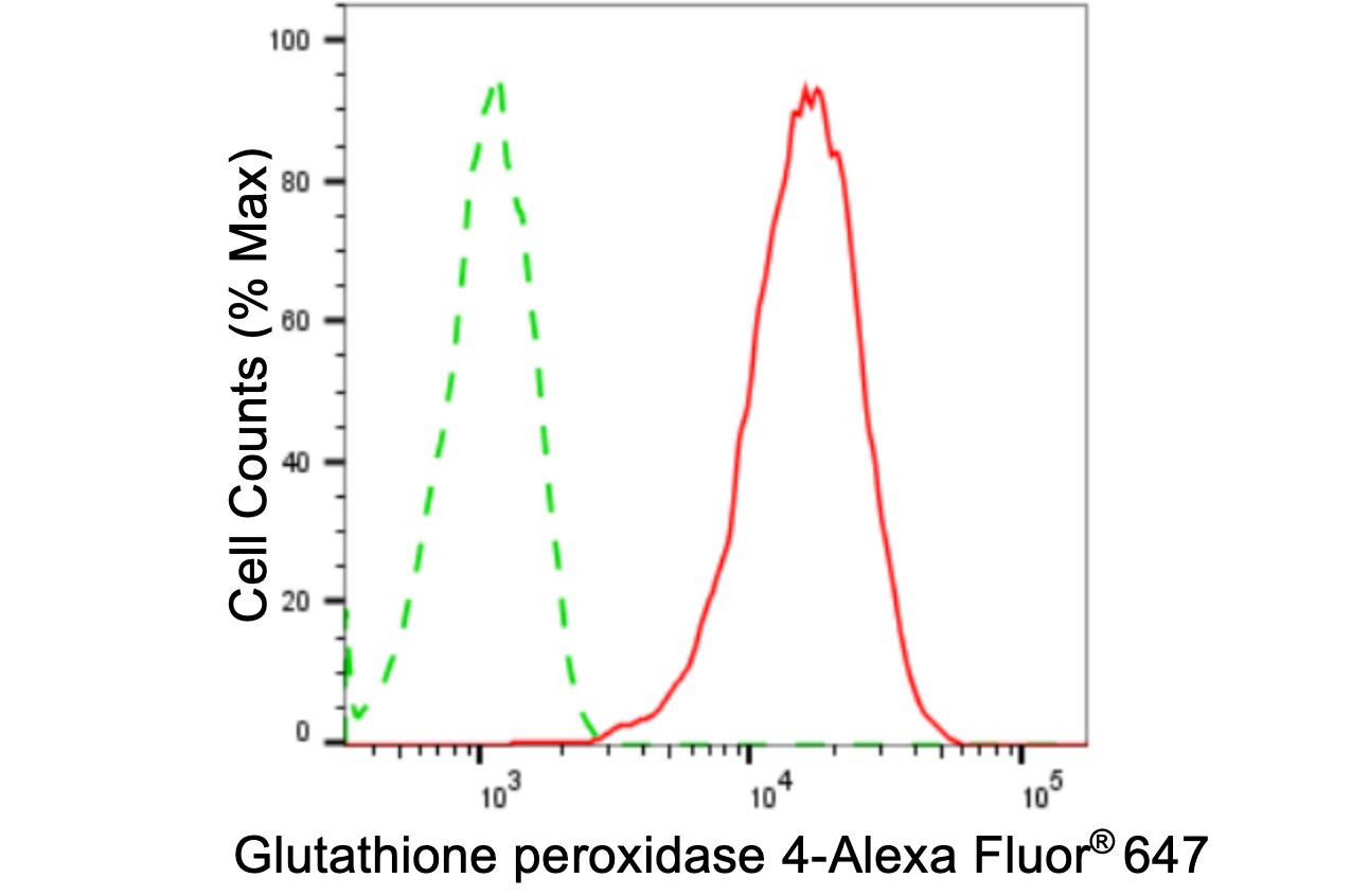 • Flow cytometric analysis of glutathione peroxidase 4 expression in HAP-1 cells using glutathione peroxidase 4 antibody. Green, isotype control; red, glutathione peroxidase 4.