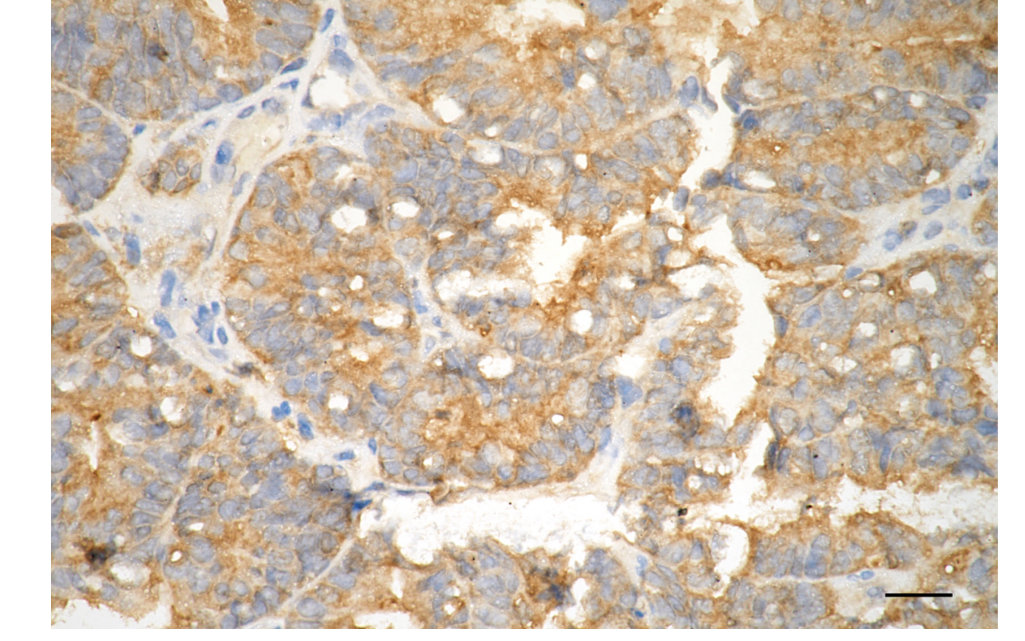 • Immunohistochemistry was performed on paraffin-embedded human endometrial carcinoma using glutathione peroxidase 4 antibody. Antigen retrieval was done in sodium citrate buffer (pH 6.0). DAB was used for detection, with hematoxylin counterstaining. Images were acquired using a Nikon Ci-L Plus microscope (40× objective). Scale bar: 25 μm.