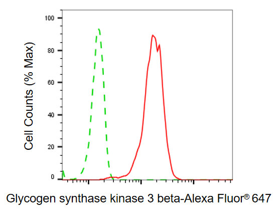 Flow cytometric analysis of glycogen synthase kinase 3 beta expression in HT-1080 cells using glycogen synthase kinase 3 beta antibody. Green, isotype control; red, glycogen synthase kinase 3 beta.