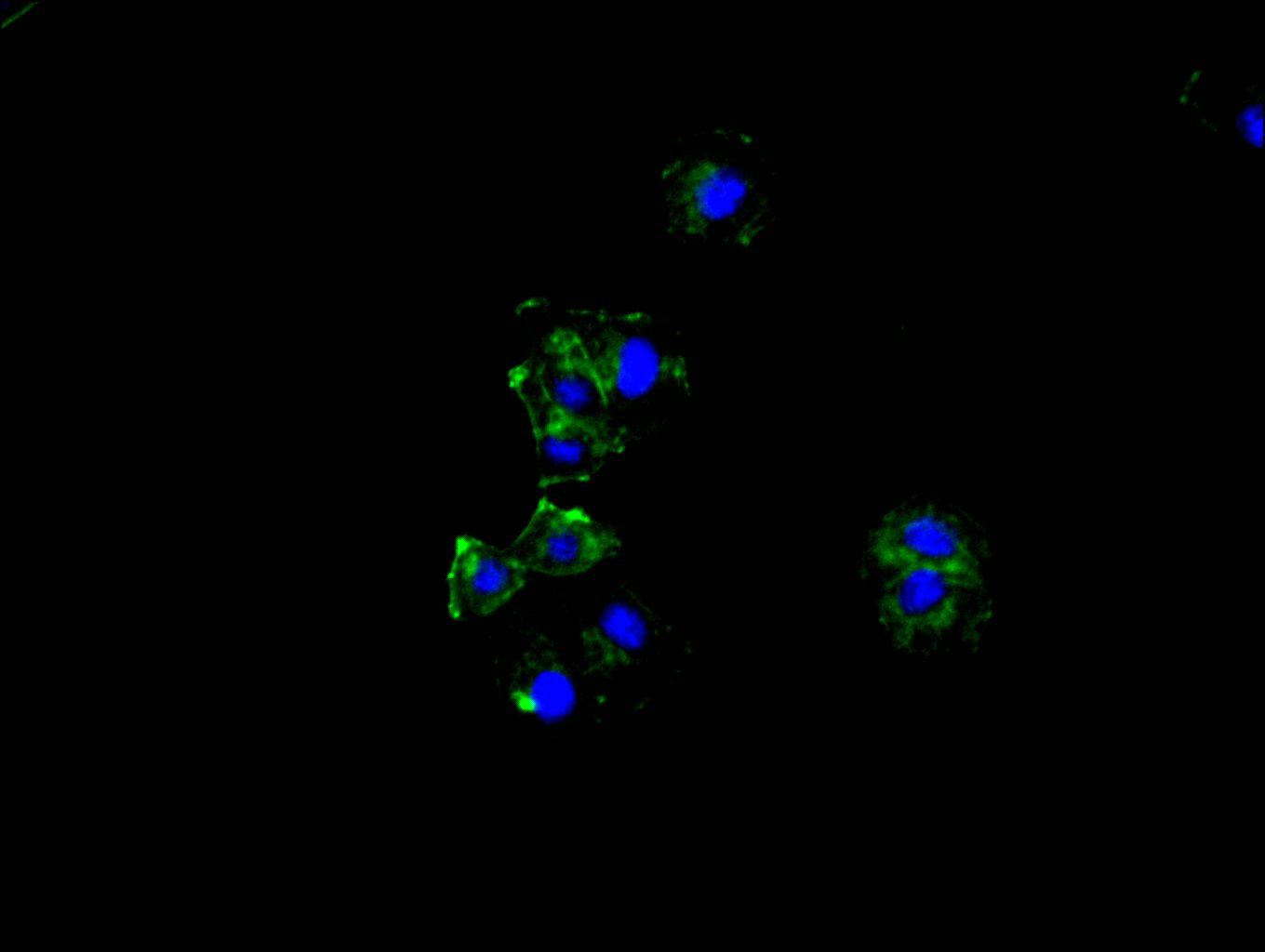Immunofluorescence staining of NIH/3T3 cell with CSB-RA009965MA1HU at 1:50, counter-stained with DAPI. The cells were fixed in 4% formaldehyde and blocked in 10% normal Goat Serum. The cells were then incubated with the antibody overnight at 4C. The secondary antibody was FITC-conjugated AffiniPure Goat Anti-Rabbit IgG(H+L).