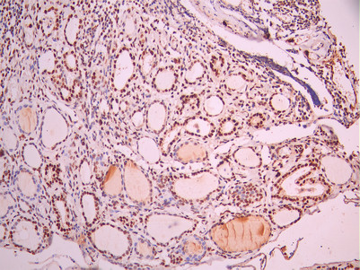 IHC image of CSB-RA781541A0HU diluted at 1:100 and staining in paraffin-embedded human thyroid tissue performed on a Leica BondTM system. After dewaxing and hydration, antigen retrieval was mediated by high pressure in a citrate buffer (pH 6.0). Section was blocked with 10% normal goat serum 30min at RT. Then primary antibody (1% BSA) was incubated at 4°C overnight. The primary is detected by a Goat anti-rabbit polymer IgG labeled by HRP and visualized using 0.05% DAB.