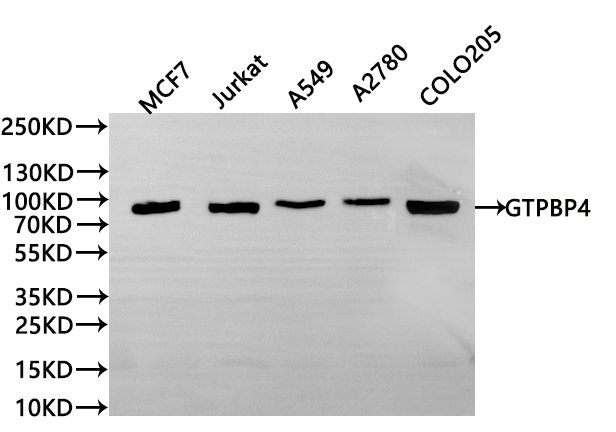 Positive WB detected in: MCF7 whole cell lysate(30μg), Jurkat whole cell lysate(30μg), A549 whole cell lysate(30μg), A2780 whole cell lysate(30μg), COLO205 whole cell lysate(30μg)