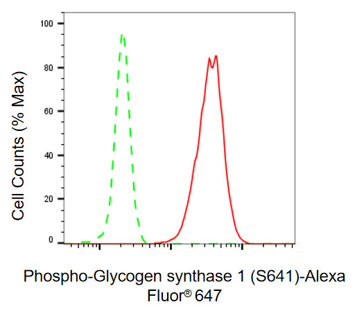• Flow cytometric analysis of phospho-glycogen synthase 1 (S641) expression in HepG2 cells using phospho-glycogen synthase 1 (S641) antibody. Green, isotype control; red, phospho-glycogen synthase 1 (S641).