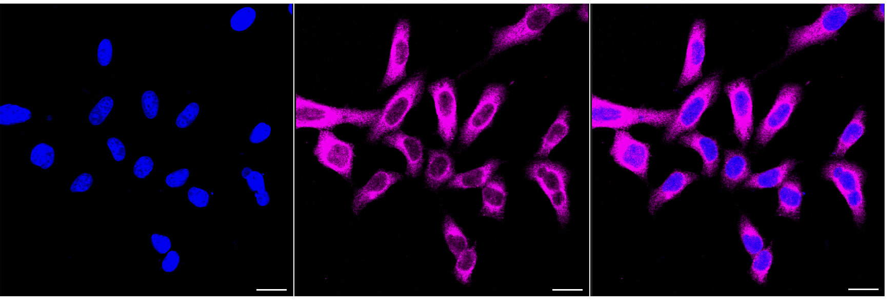 • Immunocytochemical staining of HepG2 cells with phospho-glycogen synthase 1 (S641) antibody. Nuclei were stained blue with DAPI; Phospho-glycogen synthase 1 (S641) was stained magenta with Alexa Fluor? 647. Images were taken using Leica stellaris 5. Protein abundance based on laser Intensity and smart gain: Medium. Scale bar, 20 μm.