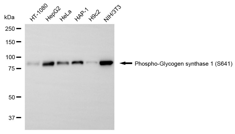 • Western blotting analysis using phospho-glycogen synthase 1 (S641) antibody. Total cell lysates (30 μg) from various cell lines were loaded and separated by SDS-PAGE. The blot was incubated with phospho-glycogen synthase 1 (S641) antibody and HRP-conjugated goat anti-rabbit secondary antibody respectively.